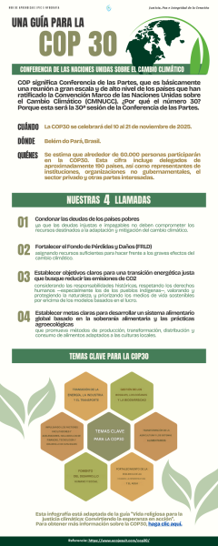 La guía destaca temas clave como la cancelación de la deuda para los países pobres, el fortalecimiento de los fondos para pérdidas y daños climáticos, el establecimiento de objetivos justos para la transición energética y la promoción de sistemas alimentarios sostenibles y adaptados a las culturas locales. Su objetivo es fomentar la justicia climática basada en el respeto a los derechos humanos, los pueblos indígenas, la naturaleza y los medios de vida sostenibles.