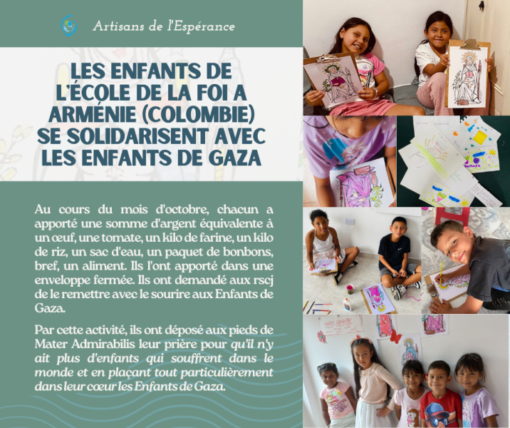 Au cours du mois d'octobre, chacun a apporté une somme d'argent équivalente à un œuf, une tomate, un kilo de farine, un kilo de riz, un sac d'eau, un paquet de bonbons, bref, un aliment. Ils l'ont apporté dans une enveloppe fermée. Ils ont demandé aux rscj de le remettre avec le sourire aux Enfants de Gaza.