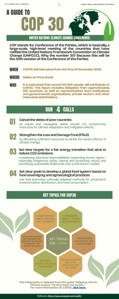 The guide highlights key topics such as debt cancellation for poor countries, strengthening climate loss and damage funds, setting fair energy transition targets, and promoting sustainable, culturally adapted food systems. It aims to foster climate justice grounded in respect for human rights, Indigenous peoples, nature, and sustainable livelihoods.