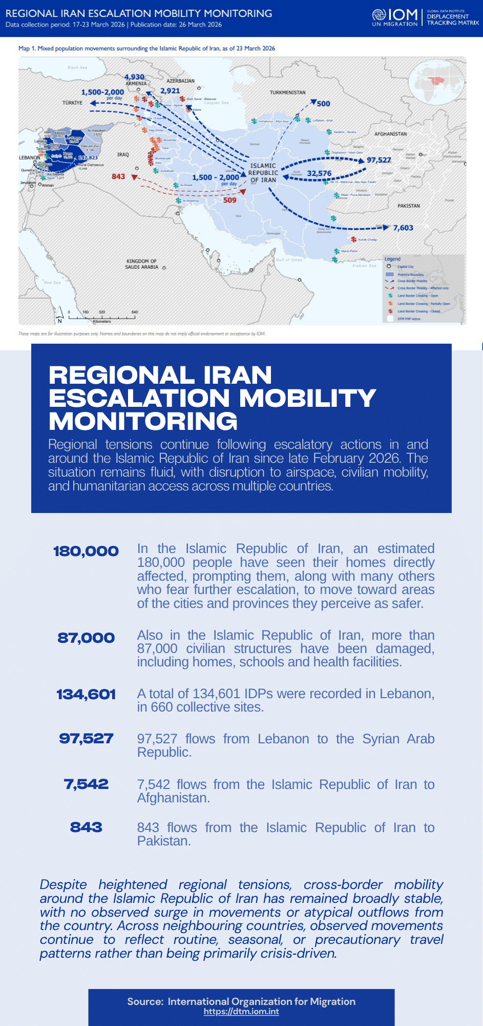 Regional tensions continue following escalatory actions in and around the Islamic Republic of Iran since late February 2026. The situation remains fluid, with disruption to airspace, civilian mobility, and humanitarian access across multiple countries.