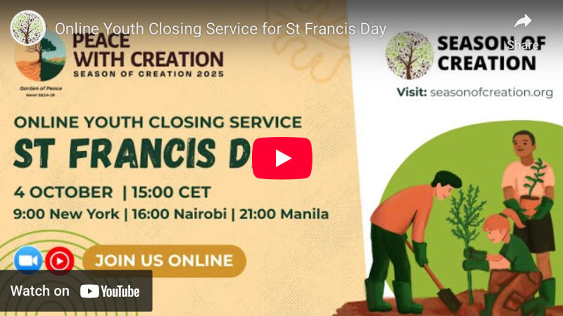 Les fidèles du monde entier sont invités à participer à un événement en ligne inspirant organisé par le Comité œcuménique des jeunes du Temps pour la Création. Ce rassemblement célébrera notre cheminement commun d'un mois de foi et de protection de la création. Pour plus d'informations, veuillez consulter le site web du Temps pour la Création et les réseaux sociaux. L'événement débutera à 15h00 CET (heure d'Europe centrale).
